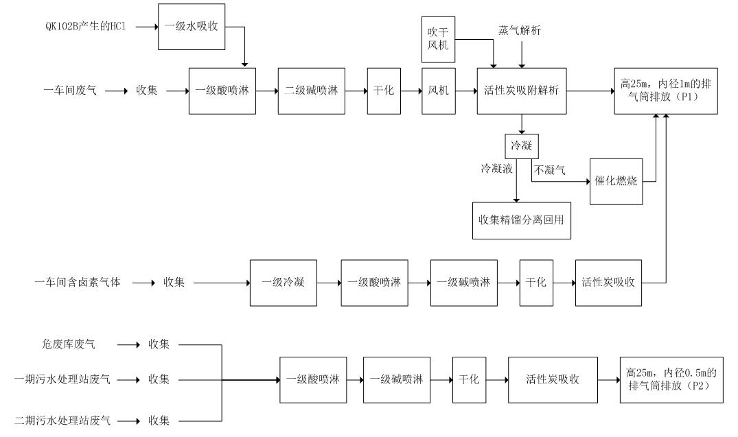 废气进入酸洗塔、碱洗塔,去除废气中的酸碱成分,后进入干化器,去除废气水分,后进入活性炭吸附装置,吸附VOCs,洁净气体通过排气筒达标排放。活性炭吸附装置为非再生式,活性炭吸附饱和之后,作为危废处理。活性炭吸附罐设计按二级吸附设计,预留装填活性炭位置。