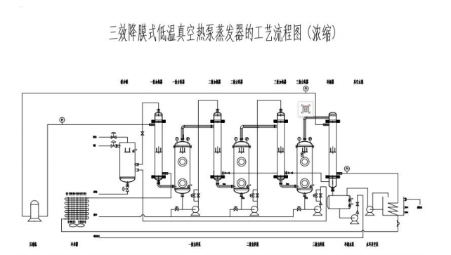 三效蒸发器主要由相互串联的三组蒸发器、冷凝器、盐分离器和辅助设备等组成(如图所示)。三组蒸发器以串联的形式运行,组成三效蒸发器。整套蒸发系统采用连续进料、连续出料的生产方式。
